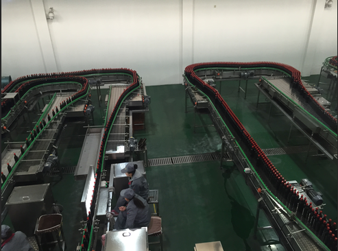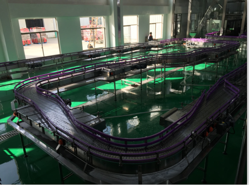 1. 無壓力輸送是由一傾斜的多列且速度不等的三段輸送鏈組成,由三個變頻調(diào)速電機傳動,設有滿瓶,積瓶和供瓶數(shù)(單位時間的供瓶數(shù))的光電檢測,根據(jù)酒機或標機發(fā)出的速度脈沖訊號,通過PLC自動同步跟蹤,改變輸送鏈的速度,以保證連續(xù),無擠壓地供瓶,此段還設有倒瓶排瓶裝置。